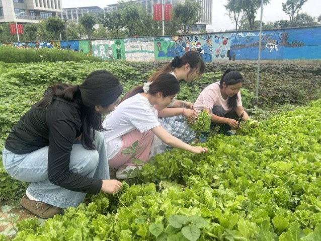 蒹葭菜园里,向日葵和格桑花开得格外烂漫。茄子在枝叶间泛着紫光,生菜像绿宝石铺满畦垄。同学们提着篮子,在老师的引导下采摘当季蔬菜。黄瓜、茄子、生菜被收入篮中,藤蔓间的清脆声响与欢笑声交织成歌。同学们还将摘下的向日葵逐一包成花束,金黄的花盘朝着骄阳,如同毕业生们灿烂的笑脸。捧着向日葵,同学们在菜园合影,定格下这方土地孕育的生机与希望。