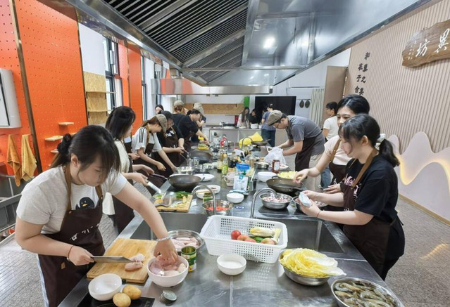 东食堂二楼的共享厨房早已热气腾腾。食堂按菜单提前备齐了各种食材,不锈钢台面上整齐摆放着油盐酱醋。同学和老师们系上围裙,戴上厨帽,化身“大厨”各显身手。热锅倒油,蒜末爆香。员工们分工协作:有人清洗刚采摘的蔬菜,有人为鸡翅改刀。“记得茄子要先煎软再调味!”“虾线要挑干净哦!”师生间的叮嘱与欢笑,让厨房变成了温馨的大家庭。